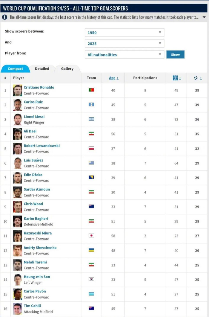 世预赛历史射手榜C罗鲁伊斯39球并列第一梅西36球第三